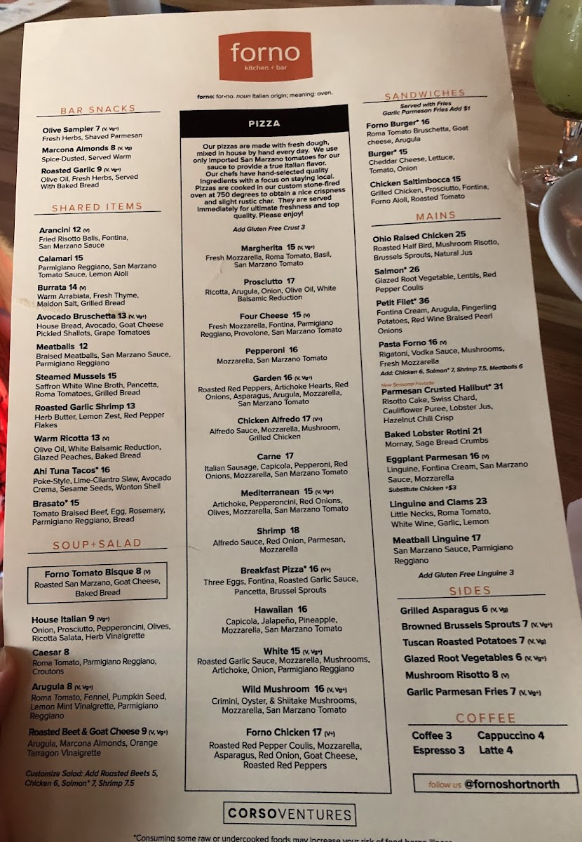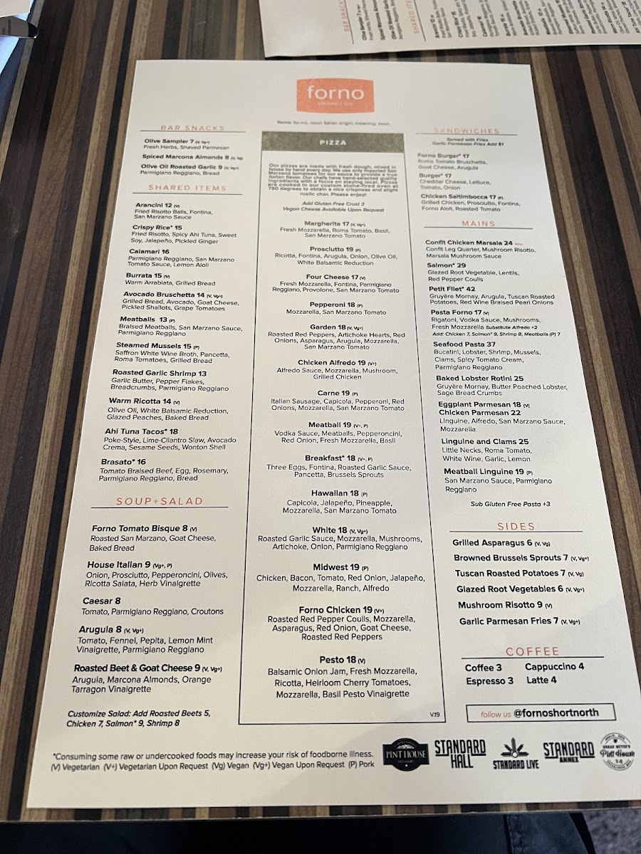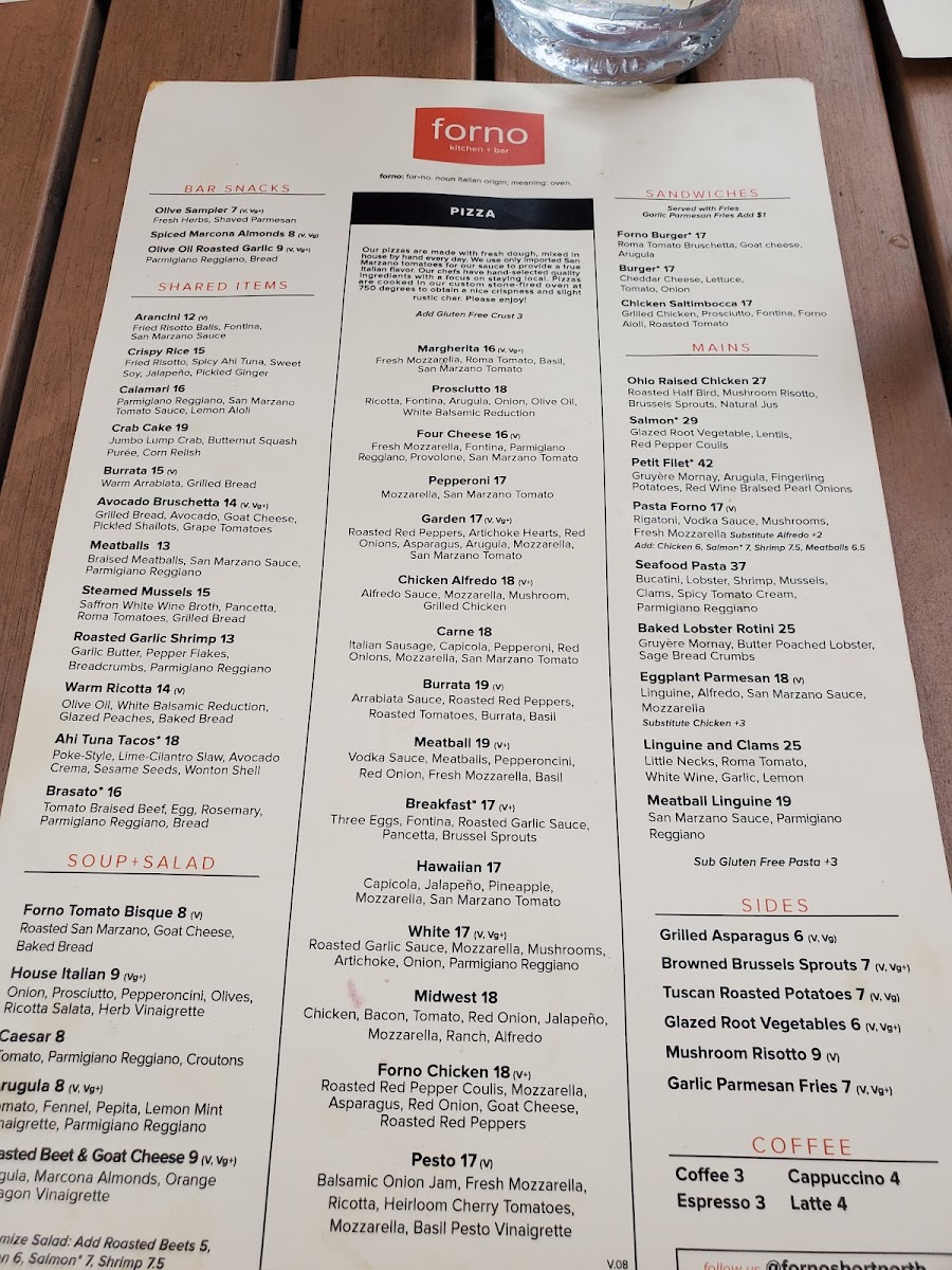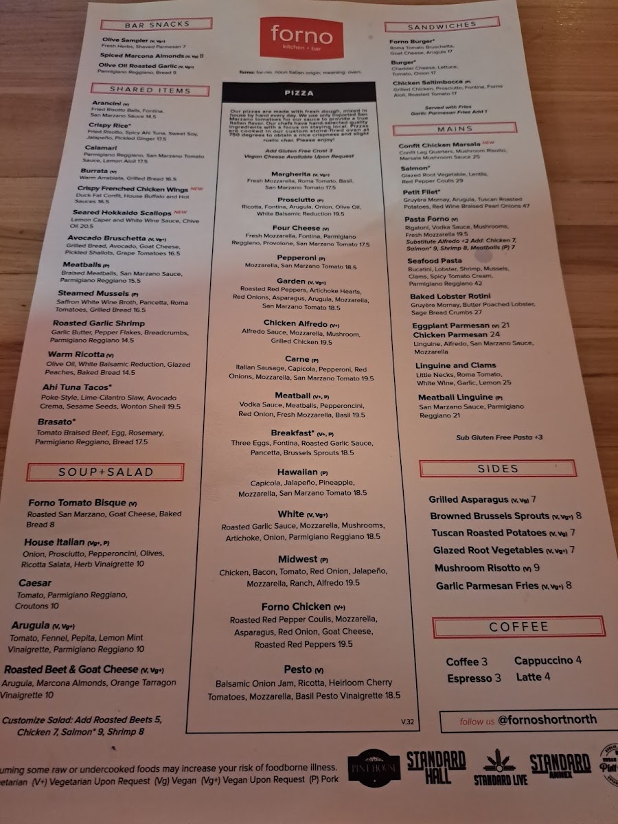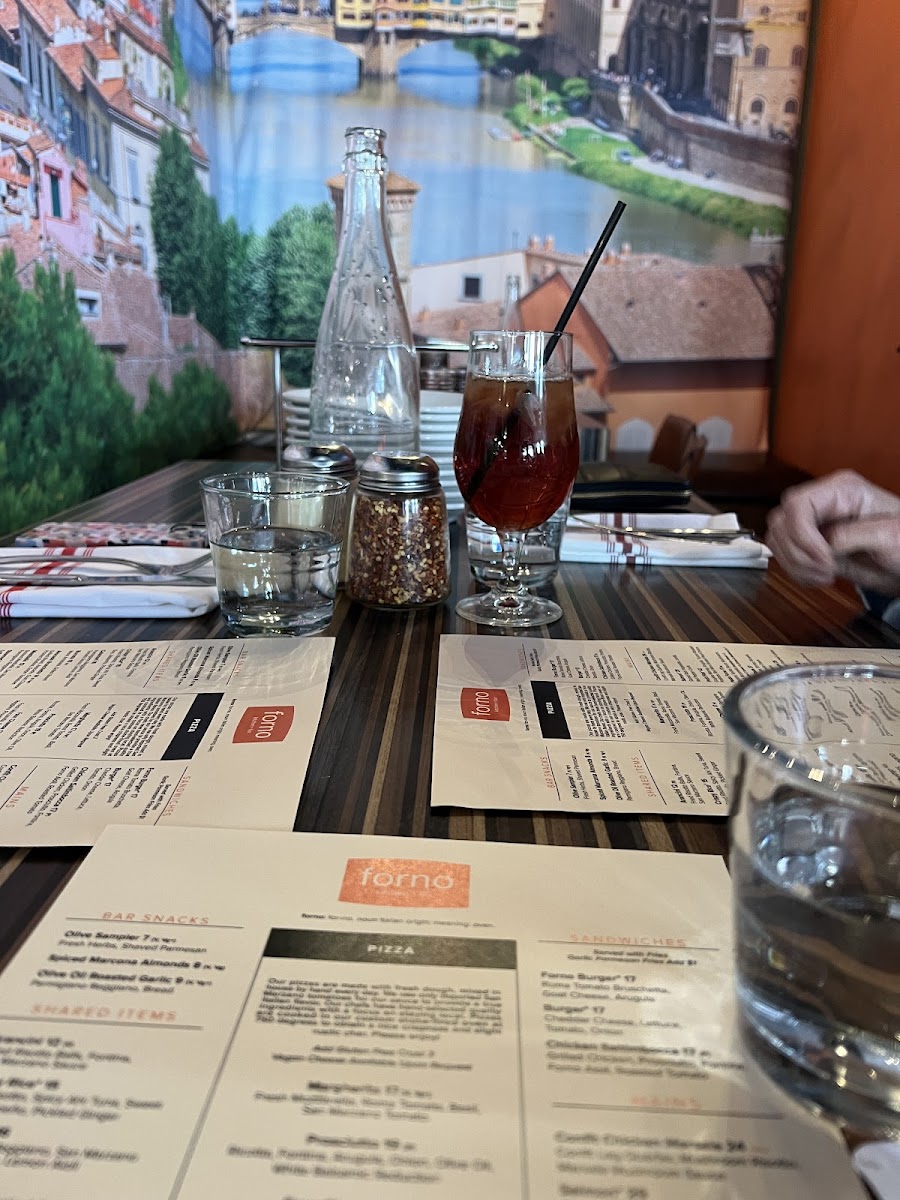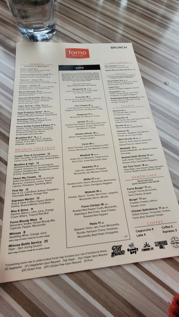 Forno's is freaking amazing! The food is quality is as delicious as its presentation. The service is friendly, helpful, informative, and attentive. The atmosphere is a VIBE! It fits and serves most purposes; from friend group, work group, date nights, and or just grabbing a drink at the bar. This is an all 5 restaurant, no complaints. We had such a great time, we went back again the following week.